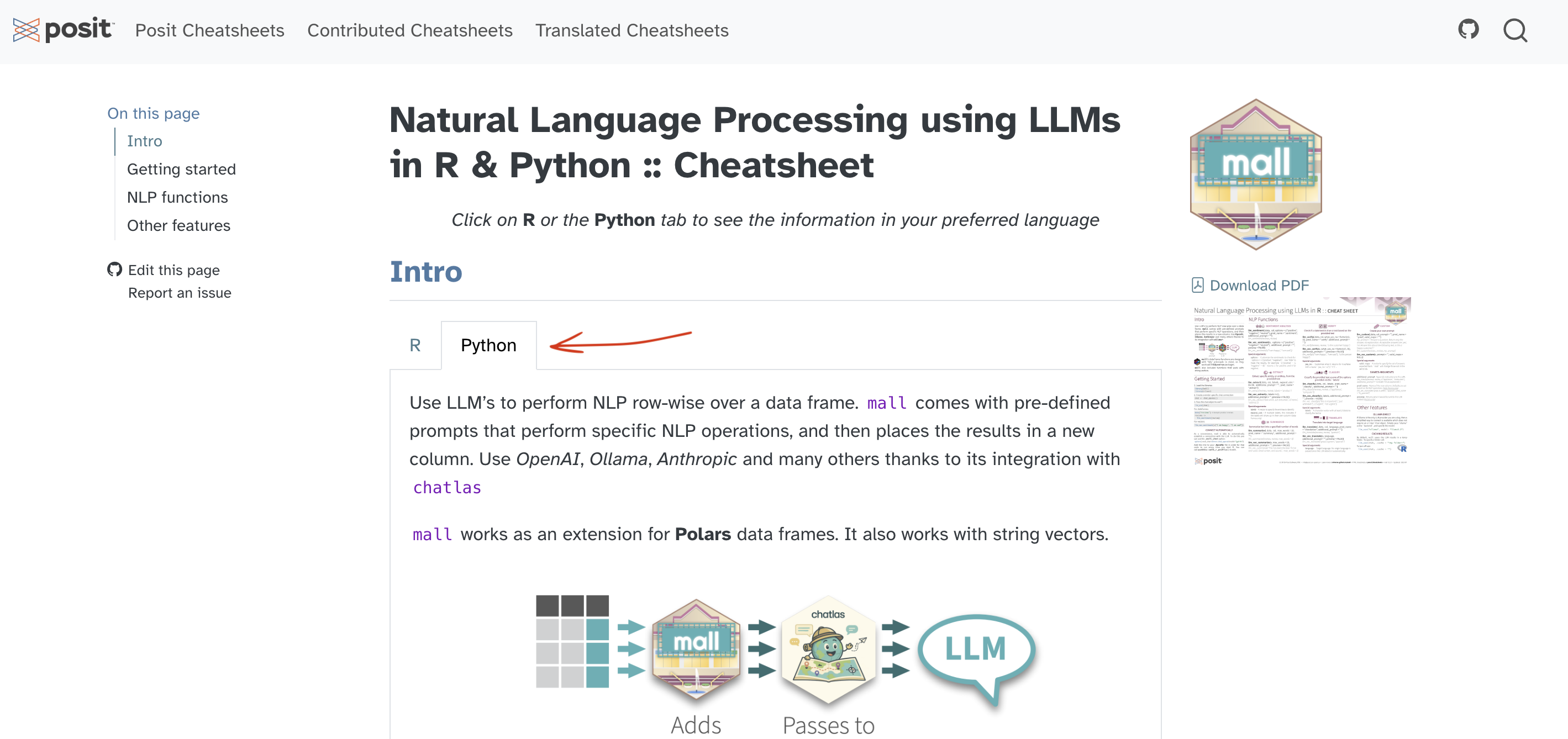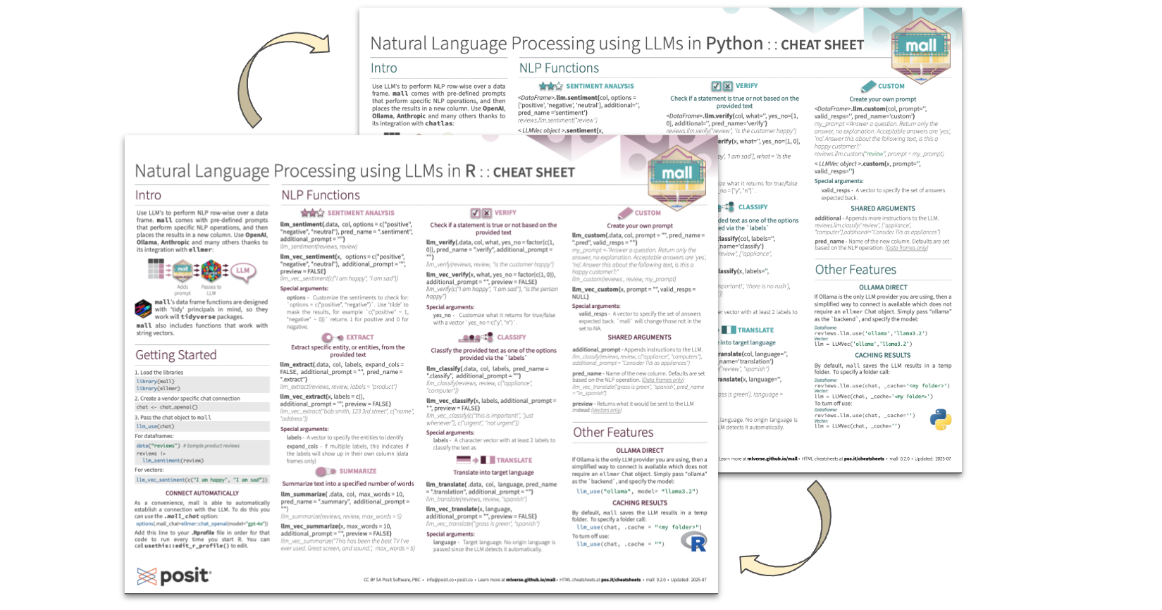 The brand new official cheatsheet is now available from Posit: Natural Language processing using LLMs in R/Python. Its mean feature is that one side of the page is dedicated to the R version, and the other side of the page to the Python version.